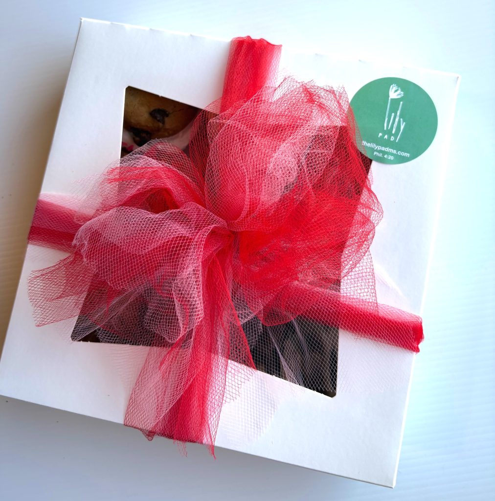 Each assorted box includes the following treats from The Lily Pad Cafe. Treats come in a white box with Valentine themed decorations. Decorations may vary from pictures.